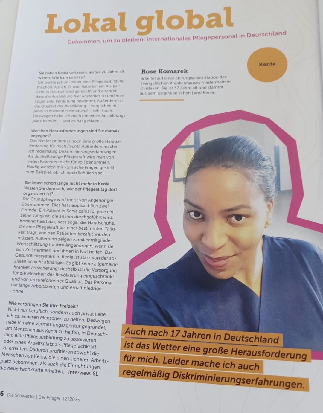 Rose berichtet in den Artikel, über ihren Werdegang in Deutschland, von der Ausbildung zur Pflegekraft bis zur Gründung einer Vermittlungsagentur. Es ist Rose wichtig eine Möglichkeit für die Lösung des Fachkräftemangels in der Pflege aufzuzeigen.